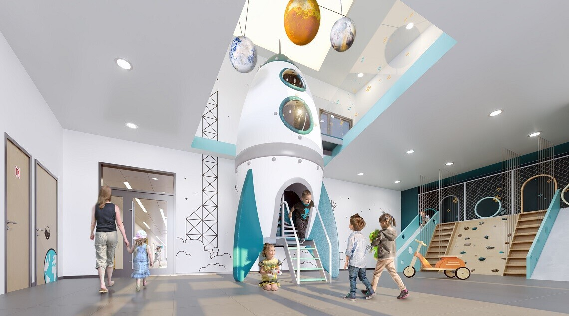 Новый садик построят рядом с сохраненным при строительстве района сквером со взрослыми хвойными деревьями. На входе в сад будет огромный космический корабль со скрытой лестницей, по которой можно подняться на второй этаж. Лампы освещения в холле будут выполнены в виде планет Солнечной системы.