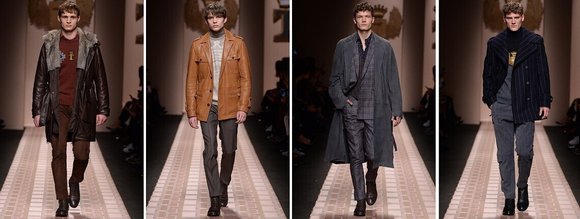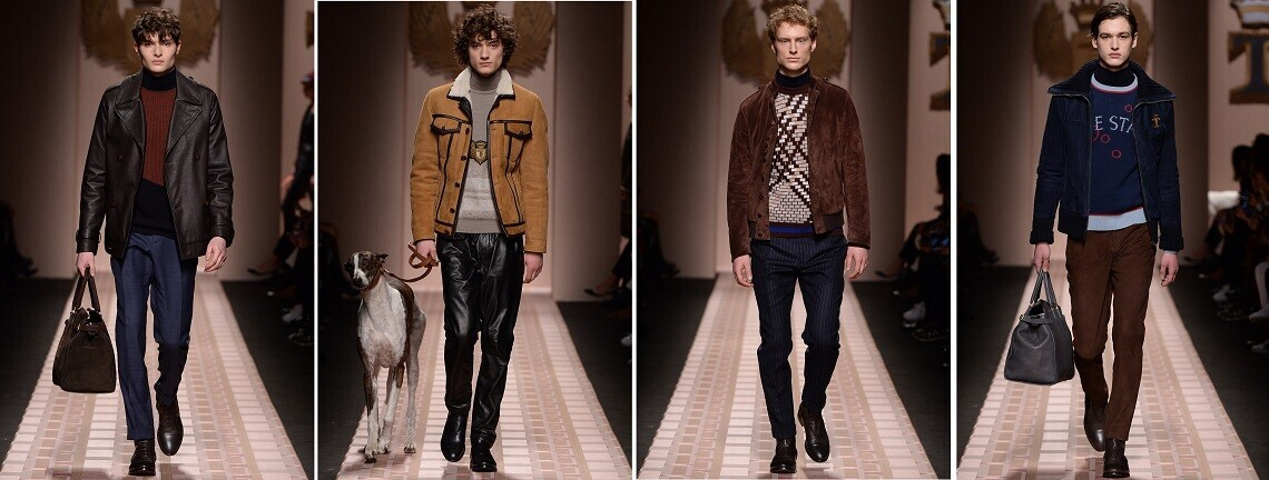 Мужская одежда опирается на классику в сочетании со стилем рок. Цветовая палитра сезона — хаки, оливково-зеленый, базальт, бордо, синий, серый и черный. Верхняя одежда представлена пальто и косухами, стегаными куртками, дубленками. Геометрический принт — яркий акцент на классических свитерах и пальто. Завершают линию джинсы и брюки чинос в разных оттенках.