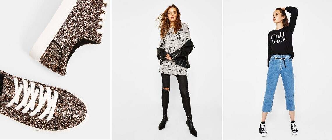 Кеды с блестками и шнуровкой, 49,9 рубля; объемная футболка с принтом, 25,99 рубля; толстовка с надписью и боковыми разрезами, 29,99 рубля