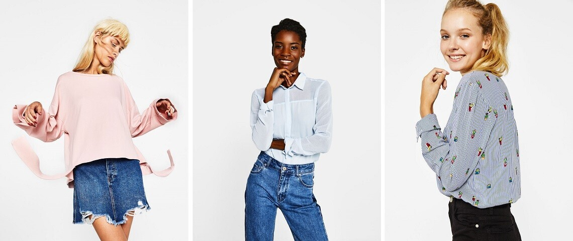 Укороченная толстовка с эластичным поясом, 49,99 рубля; рубашка струящегося кроя, 29,99 рубля; укороченная рубашка с пуговицами на спине, 39,99 рубля