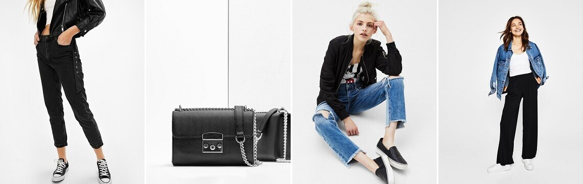 Джинсы Mom Fit, 59,99 рубля; сумка с застежкой и цепочкой, 55,99 рубля; куртка-бомбер из мягкой ткани, 55,99 рубля; широкие брюки из сатина, 55,99 рубля
