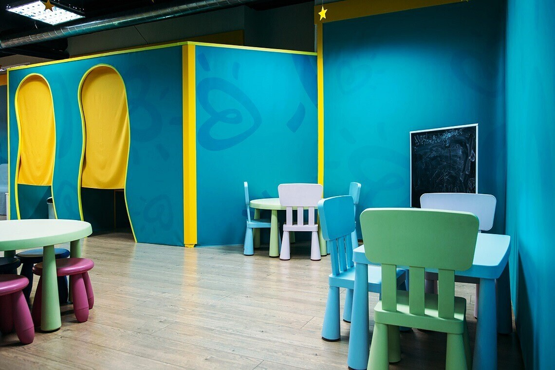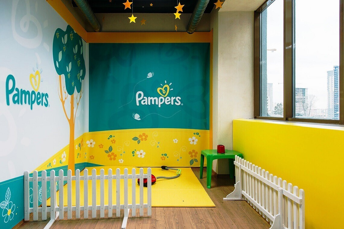 Интерьер детской комнаты выполнен в стиле Pampers; стены покрыты разноцветными декорациями на тему природы, к потолку подвешены желтые звезды. Основной зал с детскими столами, стульями и доской можно использовать для совместного творчества или обучения. Есть две кабинки с пеленальными столиками и умывальником.