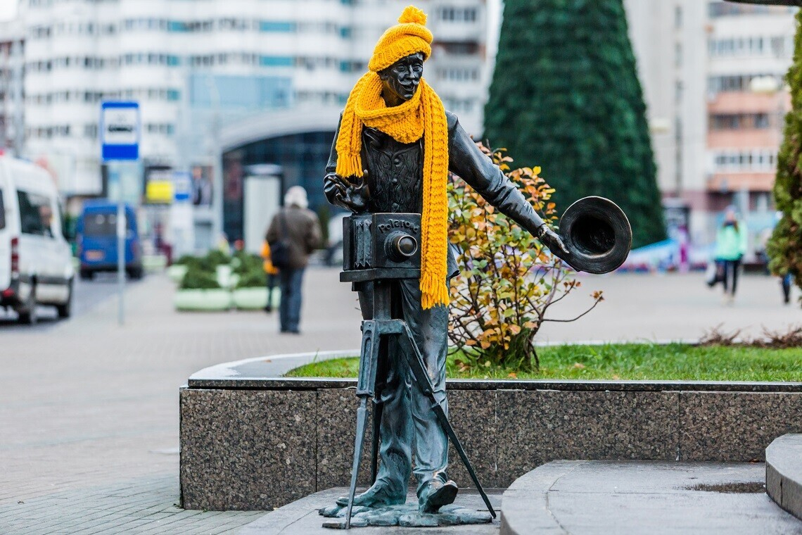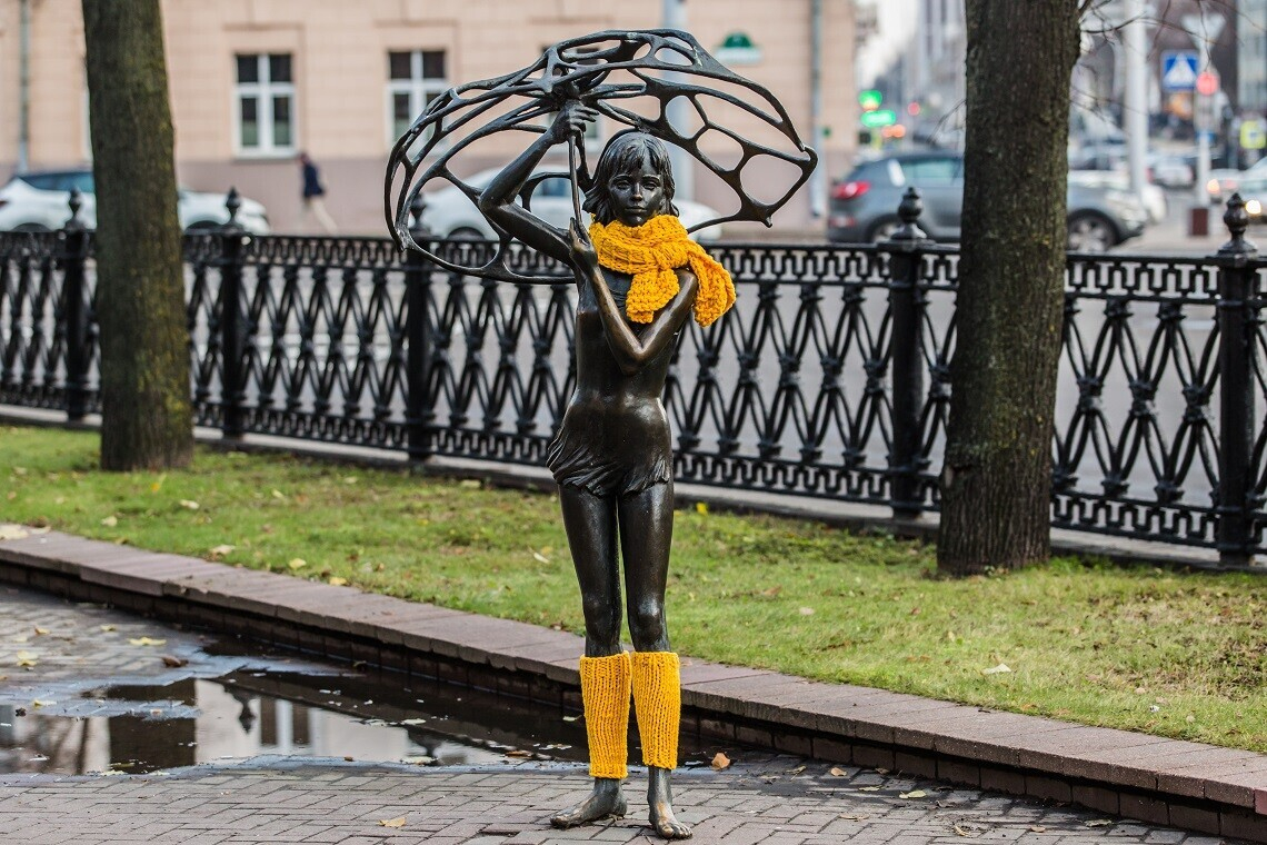 Наиболее заметным разноцветное перевоплощение было в Минске, где украсили 15 статуй: на Комаровском рынке гардероб обновили «Торговка семечками», «Дама с собачкой» и «Фотограф». В Михайловском сквере теплые вещи примеряли небезызвестная «Минчанка», задорный «Прикуривающий» и скромная «Девочка с зонтом».