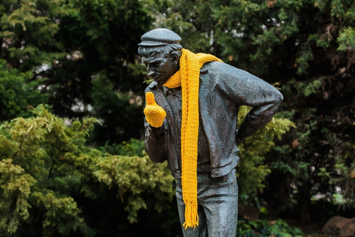 Почти 30 известных памятников в Минске и других крупных городах Беларуси укутали в желтые шарфы и шапки. Скульптуры утеплил к зиме оператор velcom, посвятив инициативу мобильным тарифам «Комфорт». Как оказалось, именно эти уютные вещи вязали вчера «штурмовик» в минском метро, светская львица Анна Бонд в витрине ГУМа, «космонавт» на остановке общественного транспорта и другие персонажи «комфортного» проекта.