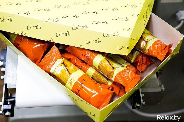 Затем сладости вновь попадают в систему охлаждения, из нее — в руки упаковщиков, а потом — в холодильник, где ждут транспортировки в магазины. Не так давно Eat me стали продавать эклеры, упакованные поштучно. Чтобы обернуть такой, установлен специальный аппарат, который принимает на ленту «голое» изделие, а выдает — в «одежке».