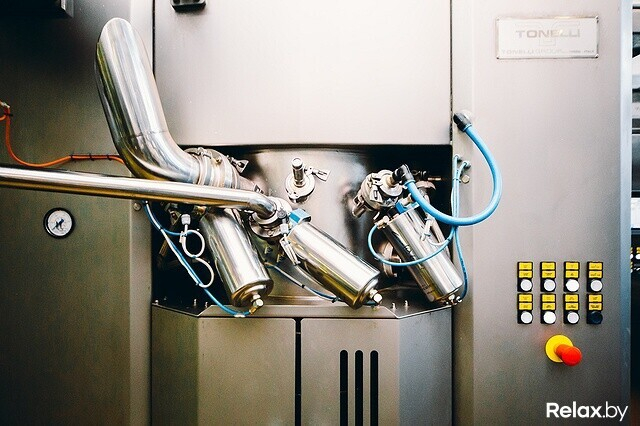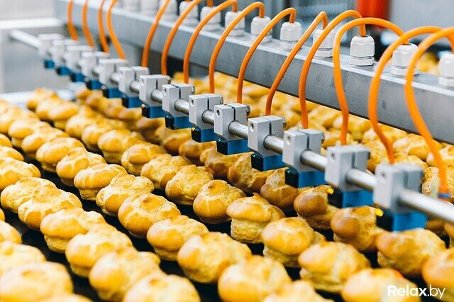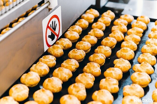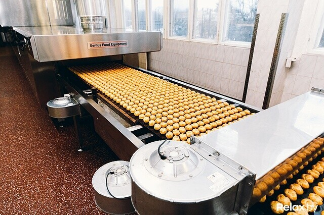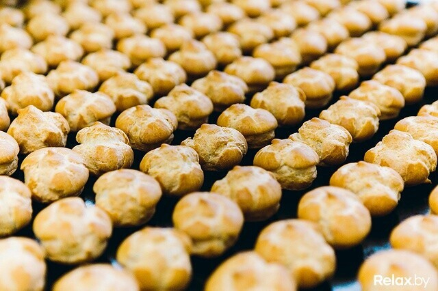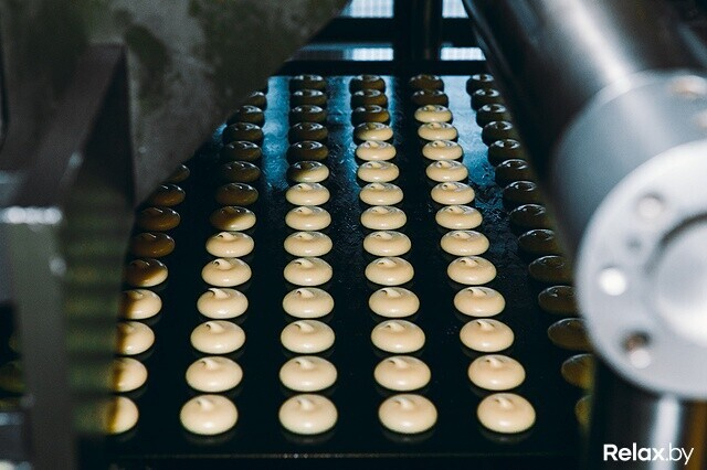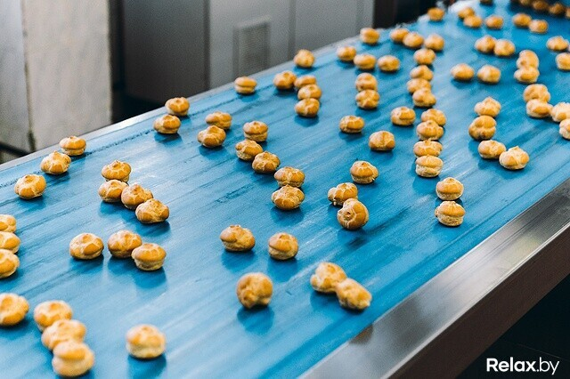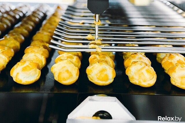 Редакция relax.by оказалась на производстве, когда выпекались профитроли с вареной сгущенкой. Оборудование кондитерского цеха запрограммировано на множество режимов. Каждый создает определенный вид пирожных: профитроли и эклеры или печенье (шоколадное и с карибе).