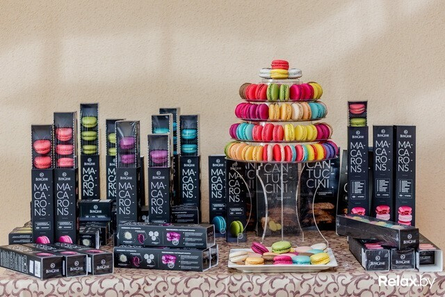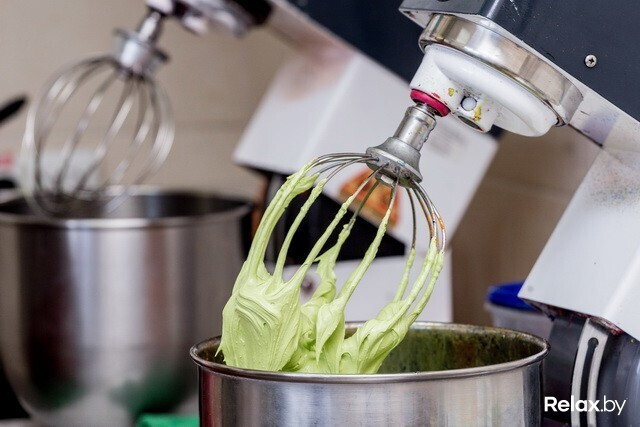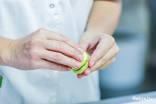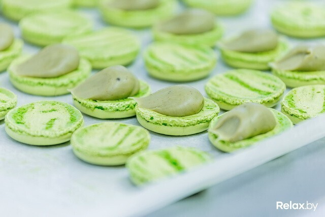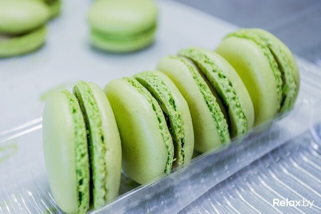 Минское производство существует с 2009 года, и именно здесь помимо других ярких десертов с 2011-го (после практики во французской кондитерской Ladurée) производят макароны. В память об обучении на стене красуется первая кондитерская лопатка; рядом, отслеживая погоду за бортом, трудится внушительный кондиционер: ему велено сохранять в цеху неизменную температуру, какая по душе капризным макаронам; гудят массивные печи, в свое время хваленые французской проверкой.