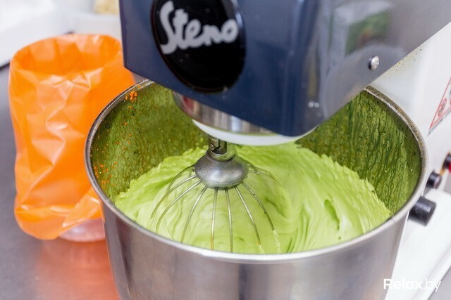 В одной чаше при помощи миксера замешивается тесто: основа бисквита создается из дробленого миндаля (миндальной муки), яичных белков и сахарной пудры. Кстати, миндальная мука прибывает в цех из Европы. В другой чаше взбивается еще недавно бурливший на печи сахарный сироп с уже упомянутыми белками. Добавляют и пищевой краситель необходимого цвета (на самом кончике ножа). Должен получиться правильный бисквит, так что в процессе крайне важно сохранять ювелирные пропорции, контролировать температуру. Соединив содержимое обоих сосудов, массу остужают и помещают в кондитерские мешки.