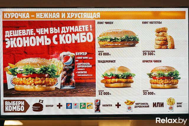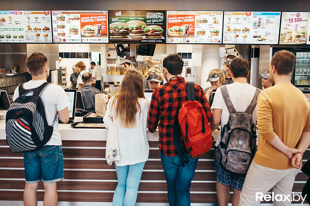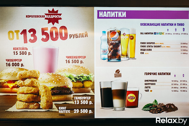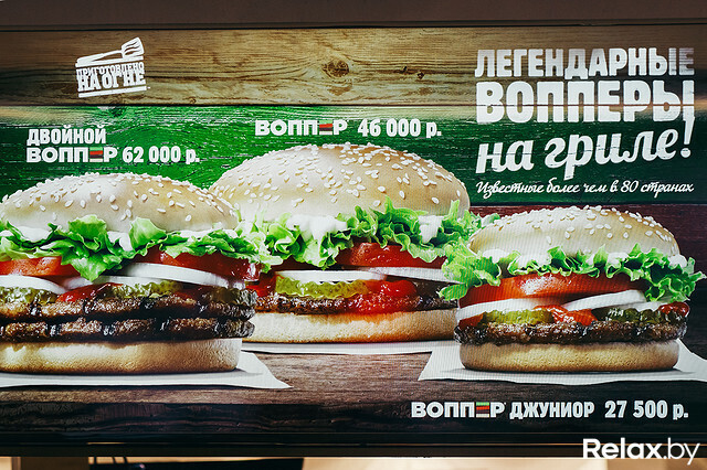 Только вчера в районе вокзала открылся новый, 8-й по счету McDonald`s, как уже сегодня в Минске распахнул двери легендарный Burger King — ресторан сети американского фастфуда, составляющей главную конкуренцию McDonald`s. Заведение расположилось прямо у ст. м. «Каменная горка» по адресу: ул. Притыцкого, 154. И ждали его открытия с начала июня, когда по всему городу аккурат напротив ресторанов McDonald`s разместили наружную рекламу «Кинга». Relax.by побывал на открытии заведения, протестировал фирменные бургеры и сравнил цены и обслуживание с McDonald`s.