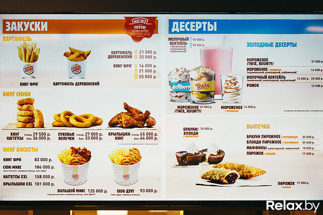 Также из бургеров в меню Burger King «Лонг Биф» (41 000 руб.), «Бургер Кинг Стандарт» (34 000 руб.) и «Бургер Кинг XXL» (61 000 руб.), двойной чизбургер (28 500 руб.). По желанию во все бургеры можно добавить сыр и перец.