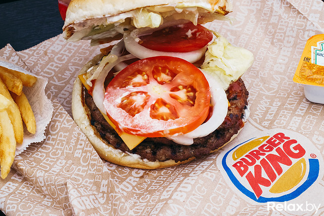 Центральное место в меню занимает бургер Whopper, который представляет собой гамбургер с зажаренной на гриле говяжьей котлетой весом в среднем чуть больше 110 г, кунжутной булочкой, майонезом, салатом, нарезанными отдельно помидорами, солеными огурцами, кетчупом, ломтиками репчатого лука и плавленым сыром. Стоит стандартный бургер Whopper в Минске 46 000 рублей, двойной Whopper обойдется в 62 000.