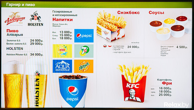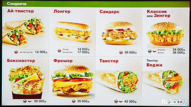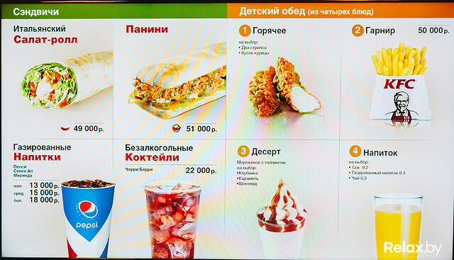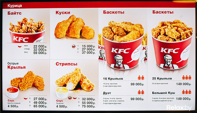 Меню из 50 позиций было обнародовано заранее: в КFC, как и обещали, продают белорусское пиво, есть выбор из нескольких десертов, кофе с сиропом на выбор и безалкогольный мохито. Цены в Минске чуть ниже, чем у европейских соседей: например, девять крылышек обойдутся в 63 000 рублей, девять стрипсов, благодаря MсDonald’s больше известных как наггетсы, — в 74 000 рублей, баскет (ведро) из 25 крыльев — в 139 000 рублей. Цены на бургеры чуть ниже, чем у конкурента через дорогу. Заплатить придется от 16 000 до 55 000 рублей.
