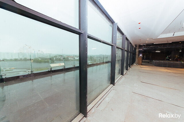 Во время январского визита Relax.by не смог в полной мере оценить привлекательности террасы, пристроенной по всему периметру шестого этажа: она была завалена метровым слоем снега. На ее общей зоне сможет отдохнуть каждый посетитель фуд-корта; рестораны центра получат по отрезку террасы, который смогут тематически декорировать. Уже сейчас она готова предложить первым гостям отличные виды на центр Минска.