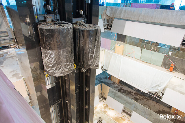 Очень важной составляющей атмосферы здесь считают освещение, так что помимо естественных солнечных лучей, проникающих в здание сквозь витринные окна, поиграли с подсветкой на неровных стилизованных потолках, которые только и ждут того, чтобы с них сняли защитные пленки. Электрика давно смонтирована; на некоторых этажах постоянно включен свет. Яркие, еще не прикрытые плафонами лампы зажжены в готовом белоснежном потолке; подсветка горит вдоль стен и по периметру атриумов каждого этажа. Эскалаторы и лифты (в том числе панорамные) закреплены и готовы к запуску, но пока прикрыты целлофаном.