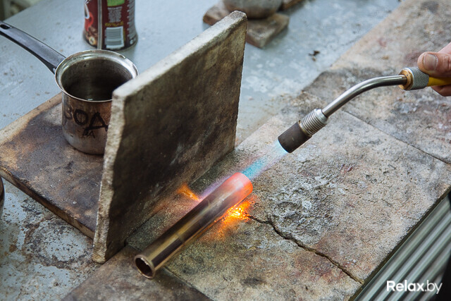 Перед нами вновь золотая труба, которую уже разрезали на три части. Далее металл отжигают. Так он станет мягче и будет «тянуться».