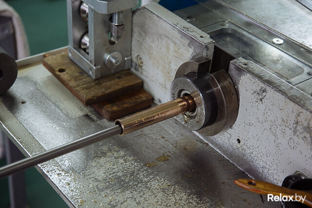Вскоре показываются очертания золотой трубы непривычного цвета. Она сделана из сплава золота 585 пробы. Сейчас перед нами только заготовка. На соседнем участке из нее «нарежут» кольца, а затем они пройдут обработку и полировку. Мы еще вернемся к свадебным аксессуарам, а пока что перед нами — двери участка изготовления восковых моделей.