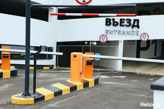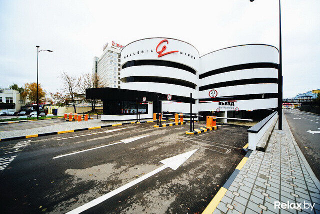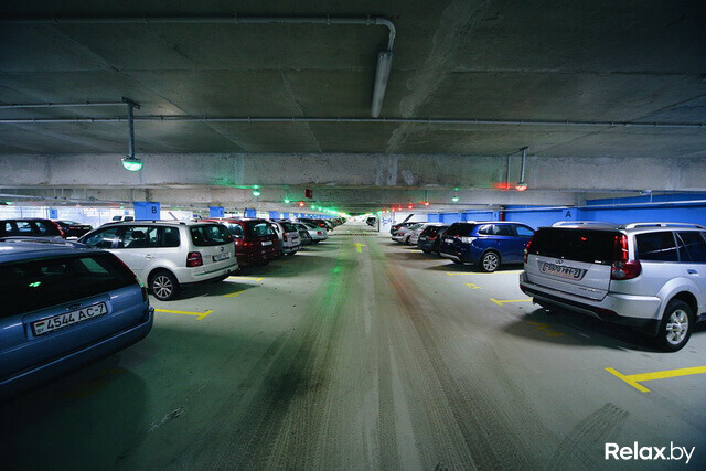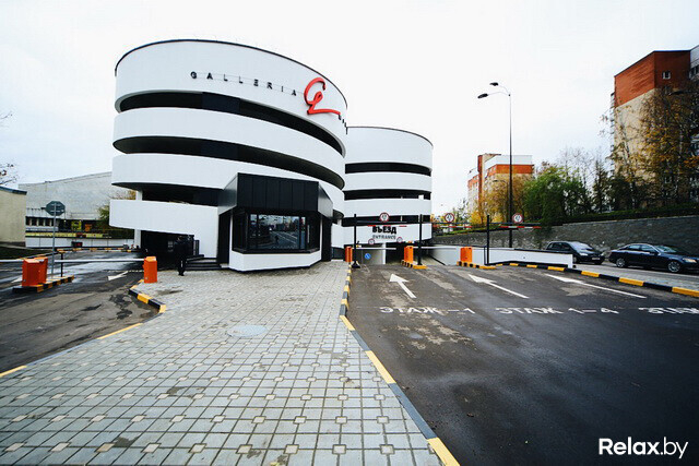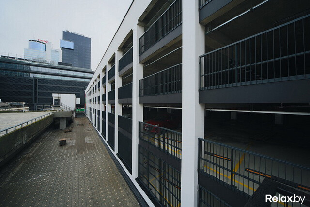 Одна из самых крупных охраняемых стоянок Минска заняла площадь в 27 тыс. «квадратов». Внушительная пристройка к Galleria Minsk буквально втиснута между кинотеатром «Москва» и жилой зоной. Фасад паркинга облицован панелями из композитного алюминия, а узор на нем повторяет «мантию» торгового комплекса. Стоянка уникальна эксплуатируемой крышей: вполне возможно, в теплое время здесь станут устраивать вечеринки под открытым небом (технически такая возможность есть уже сейчас, жаль, погода неподходящая).