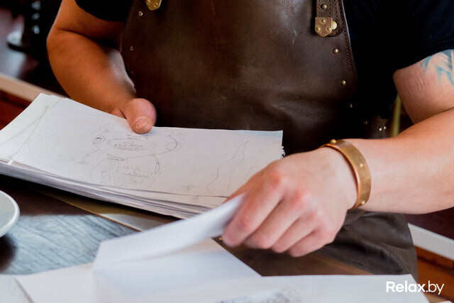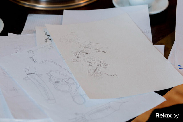 Напоследок мастер с гордостью демонстрирует наброски старшего сына — дирижабли, фантастические аппараты: «Он у меня учится в школе искусств. Говорят, графика у него хорошо поставлена. Приходит — помогает мне в мастерской, рисует. Так что, знаете, не надо мне сторонних никаких учеников. Сын вырастет — ему все свое богатство и знания передам».