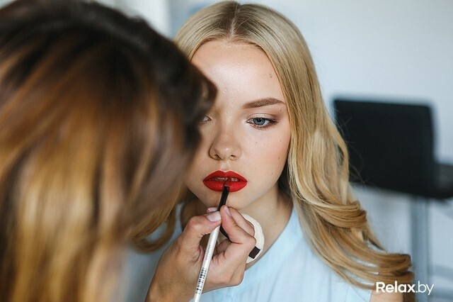 Кстати, в глупый миф о том, что девушка с маленькими губами должна забыть о красной помаде, верить не надо: помада может их значительно увеличить. Например, в работе с нашей моделью визажист вышла за естественный контур примерно на полтора миллиметра.