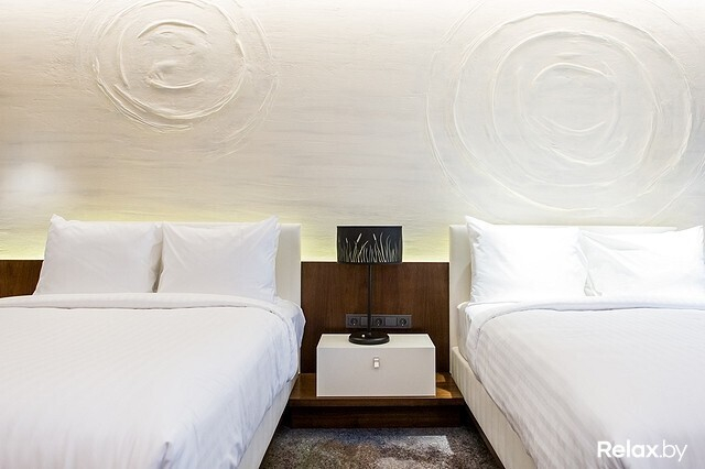 Во всех номерах — панорамные окна. В отделке использован натуральный шпон американского ореха. В тканях преобладают шерсть и натуральные компоненты.
