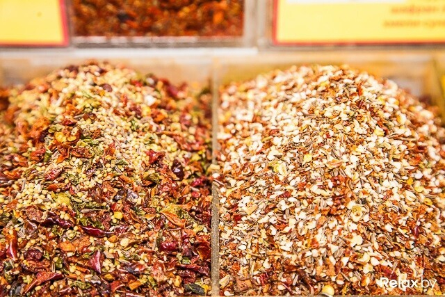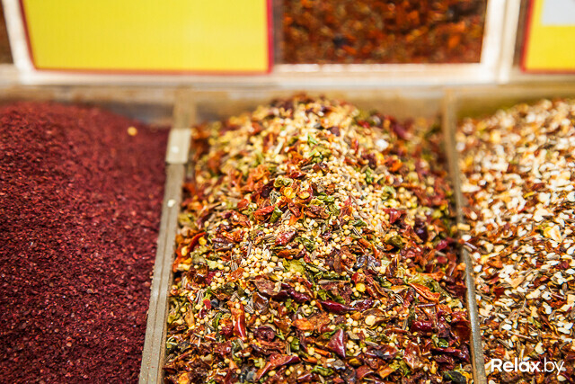 Среди готовых приправ можно найти для красного мяса (смесь карри, куркумы, сушеного чеснока, кориандра, черного перца, паприки и — по желанию покупателя — острого перца) или плова (смесь сладкого перца, паприки, сушеных листьев чабера, куркумы, хлопьев томата, семян кумина, красного и черного барбариса и шафрана). Для курицы вам смешают кунжут, паприку, куркуму, сумах, сушеный чеснок, перец чили, карри, хлопья томата, молотый имбирь и черный молотый перец.