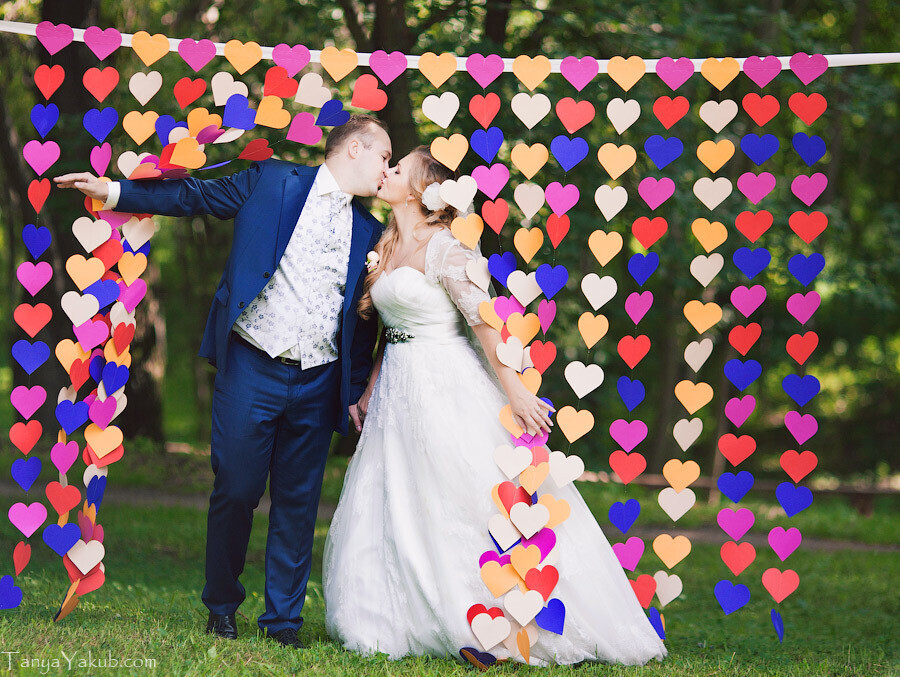 «Мы все планировали сами, без распорядителей. Но предупреждаю, многие вещи мы создавали своими руками: делали декор зоны молодоженов, это позволило сэкономить нам 400 долларов. Изначально выбрали довольно интересное место, поэтому украсили только зону молодых: с мужем вырезали сердечки из бумаги в цвет свадьбы, прострочили их на швейной машинке и сделали из них ширму за нами. Оформили стол молодоженов живыми цветами. Да, пришлось повозиться, но это того стоило, мы сами сделали свою свадьбу».