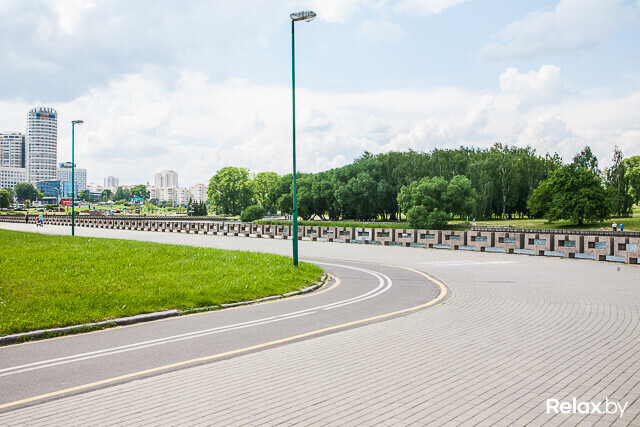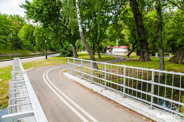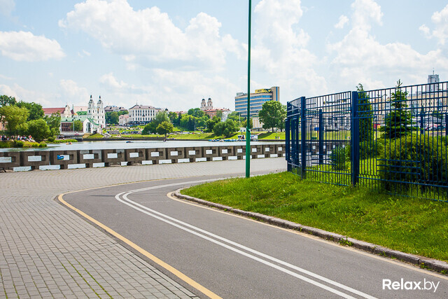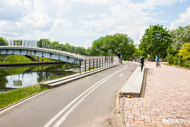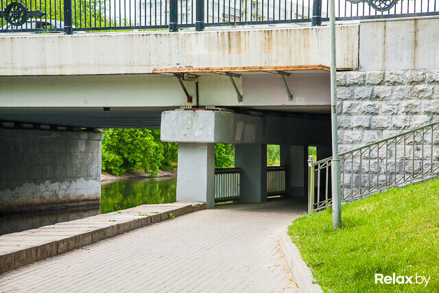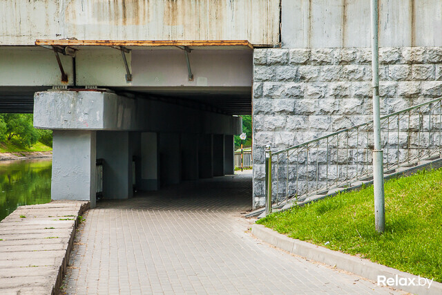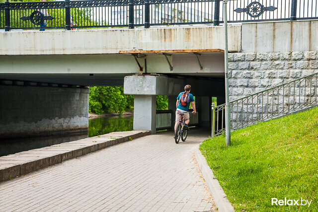 Одно из сложных для переезда мест — мост вдоль проспекта Независимости возле парка Горького. Вообще, из парка Я. Купалы велодорожка идет под этим мостом, но сейчас там идут ремонтные работы и проезд закрыт, поэтому велосипедисты вынуждены подниматься «наверх», чтобы вернуться на дорожку.