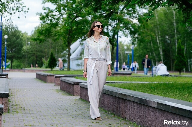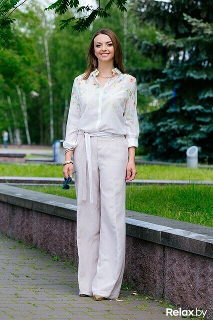 — Второй образ более повседневный, мы постарались его сделать нежным и «струящимся». В этом образе очень современно выглядит акцент на яркие и стильные солнцезащитные очки. А летящие, дышащие ткани из натуральных материалов делают наряд прекрасным вариантом для летних прогулок, к тому же он хорошо гармонизирует с особенностями фигуры Юлии, — рассказала Олеся.