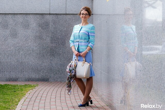 — Первый образ героини — легкая и романтичная вариация делового костюма, — прокомментировала Олеся. — Красивый оттенок голубого прекрасно сочетается с цветом кожи и делает наряд свежим и летним. Строгий покрой костюма мы «разбавили» прической с нотками ретро, что позволило сделать образ более современным и даже немного кокетливым, не прибавляя Юлии возраста.