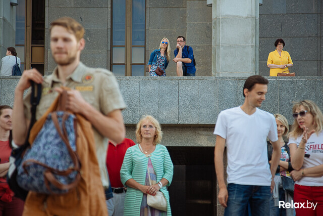 Еще только 18:40, а площадка между Дворцом Республики и летним кафе быстро заполняется людьми. Неожиданно, что в Минске столько людей слушают радио и любят танцевать.