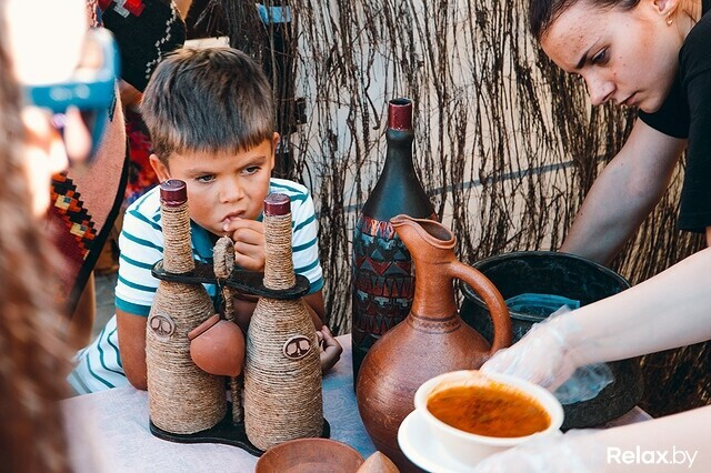 Несмотря на то, что большинство гостей плотной стеной стояло у сцены, вокруг многотысячной толпы также кипело движение: одни учились лепить кувшины для вина, другие собственноручно чеканили монеты, третьи пытались учить грузинский язык, четвертые неспешно прогуливались между многочисленными рядами с сувенирами и handmade-изделиями. К слову, грузинских сувениров не нашли ни мы, ни пытливая женщина, растерянно спрашивающая у стоящих рядом мужчин, не видели ли они палаток с безделушками из Грузии. Зато недостатка белорусских сувениров и изделий с национальной символикой, очевидно, не было.