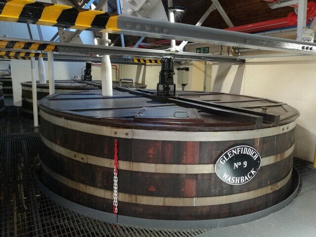 Собственно, мы получили готовый солод. Теперь начинается новый этап магии: грубо перемолотое после сушки зерно помещается в емкость для «затирания», где оно заливается горячей водой (в цеху температура о-го-го!) для растворения сахаров. Мы получаем сусло — первичный продукт, из которого потом будет выгнана партия Glenfiddich. Красавица Бет, которая сделала нам экскурсию по заводу, предложила попробовать сусло, но мы благоразумно отказались: говорят, не всякий желудок его выдерживает. Зато некоторые попробовали. Это сладкий напиток молочного цвета со специфическим запахом и вкусом, пока даже отдаленно не похож на виски, но с него как раз все начинается.
