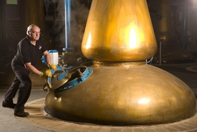 Однако до насыщенности вкусом еще далеко. Солодовое молоко отправляется в перегонный куб, из которого мы в итоге получим спирт. Собственно, все мы примерно знаем, как устроена эта штука — хотя бы по фильму «Самогонщики». Наиболее важную роль в кубе играет форма и размер горловины: от ее высоты, например, зависит вкус спирта. Если по-простому, то чем выше и уже горловина, тем тоньше аромат и «спокойнее» вкус. На заводе Glenfiddich они как раз такие — высокие и узкие.