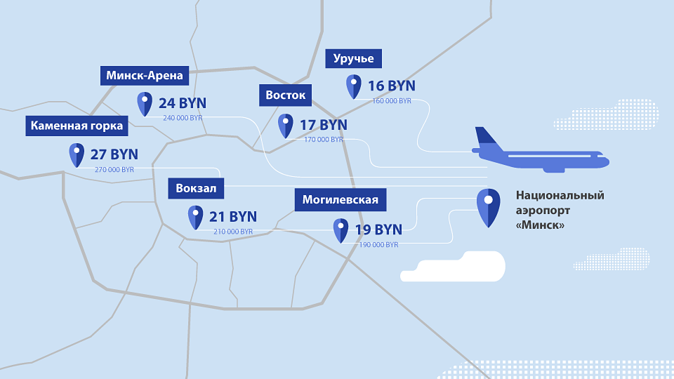 В прошлом месяце Uber установил сниженные цены на поездку в Национальный аэропорт. Минимальная стоимость (из Уручья) теперь составляет 16 (160 тыс.) руб.