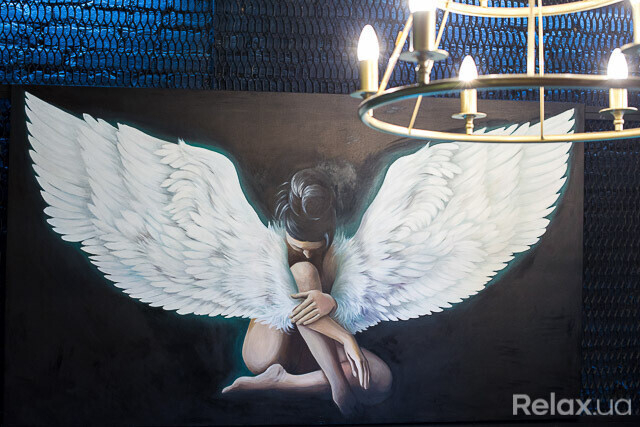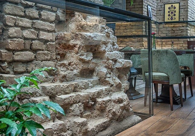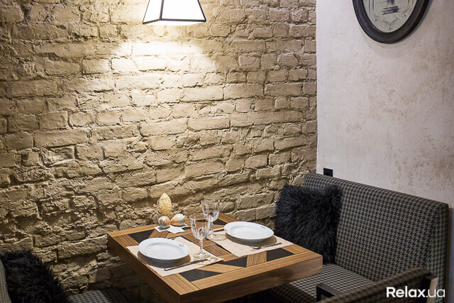 Также в заведении есть секретный зал, так называемый штаб, с небольшой библиотекой, белым камином и работами украинских мастериц, использованными в оформлении. А в последней его части можно увидеть у себя над головой Лядские ворота, стоящие на Майдане, и прямо перед собой — камни за стеклом, составляющие историческое основание ворот.