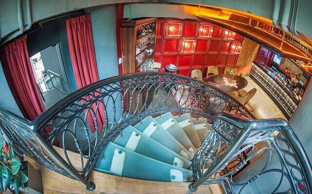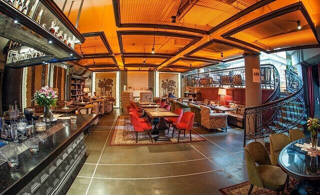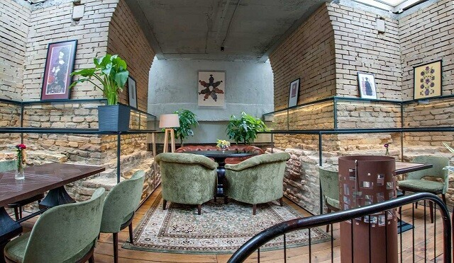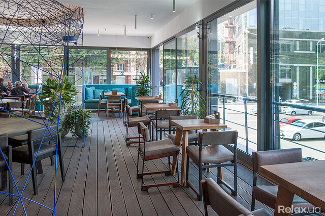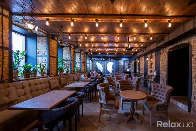 В интерьере заведения удачно сочетаются элементы старинного помещения и модерна. Дизайн на первый взгляд может показаться достаточно строгим за счет базового серого цвета, который присутствует в разных оттенках, но потом начинаешь замечать многочисленные детали, создающие уют и комфорт: мягкие диваны и удобные кресла, многочисленные зеленые растения, большие светлые окна.