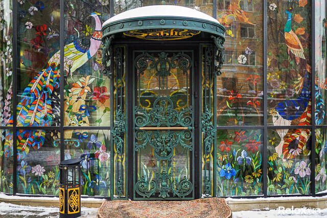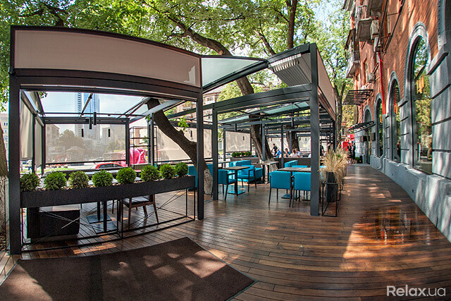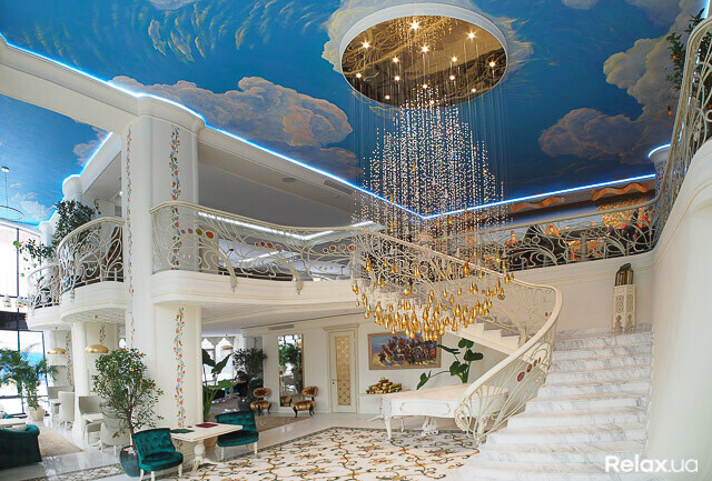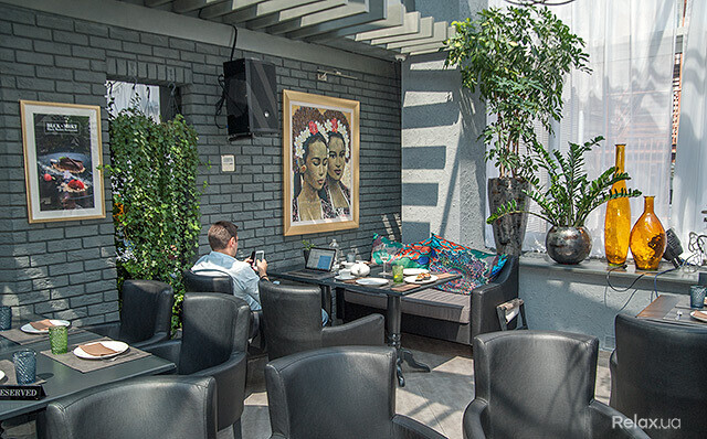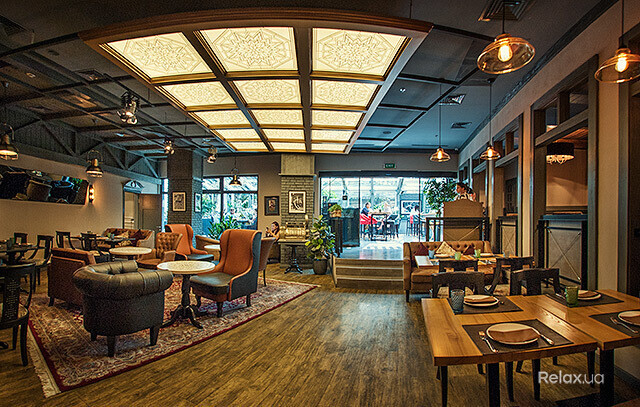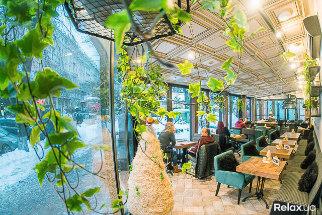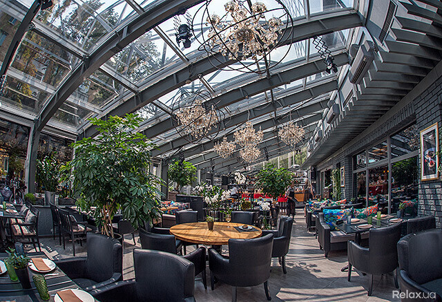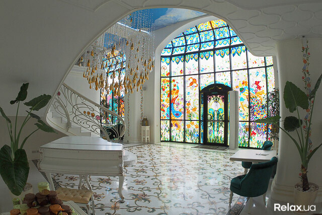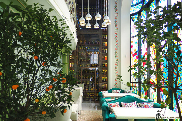 Но больше всего поражает воображение интерьер заведения: с улицы прохожие с любопытством заглядываются на большие окна с витражами, а когда заходишь внутрь, не сразу понимаешь, куда попал — в ресторан, музей или театр. Высоченные потолки, расписанные под небо с облаками, мраморные полы с восточным рисунком, дизайнерская мебель, рояль, настоящие цитрусовые деревья в больших кадках — посмотреть там точно есть на что.