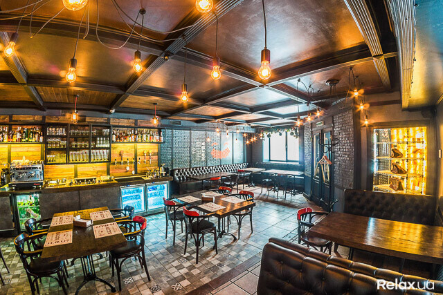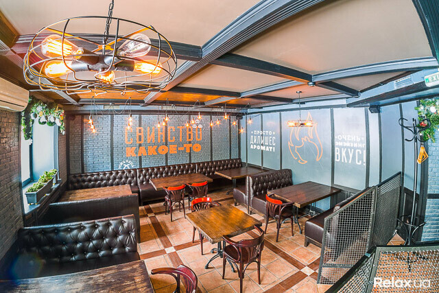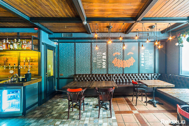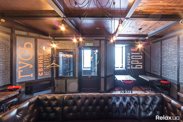 Дизайн интерьера простой и ни к чему не обязывающий, пабного формата: это кирпичные стены, основательные деревянные столы и стулья, большие диваны — все в темных тонах. На стенах забавные надписи вроде «Свинство какое-то» и «Очень эмэйзинг вкус!». А у бармена есть табличка «Не мешайте мне мешать».