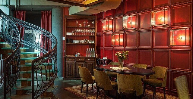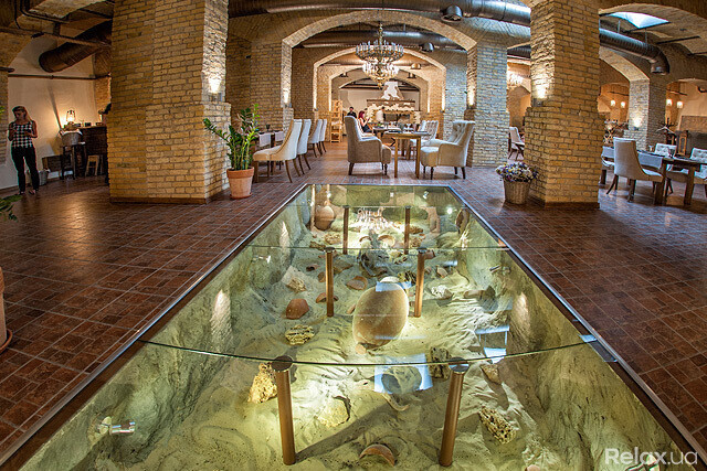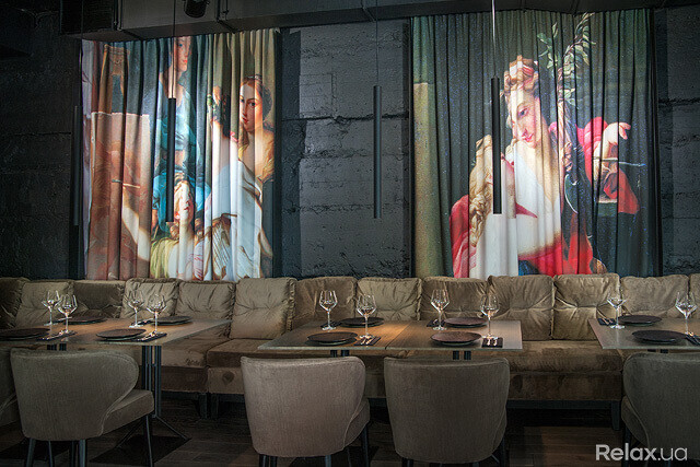 От входа лестница уводит вниз, мимо огромной винотеки и бара, в основные залы. Они небольшие и, по сути, являются, скорее, уютными уголками для компаний или пар.