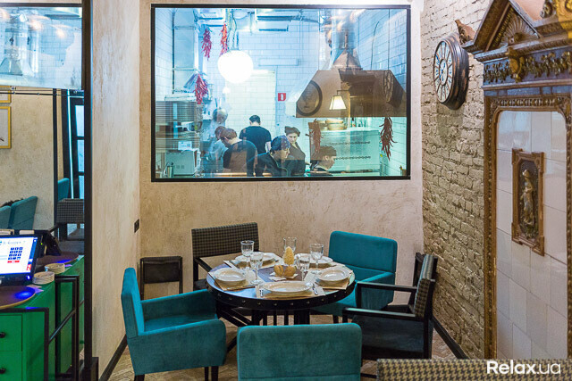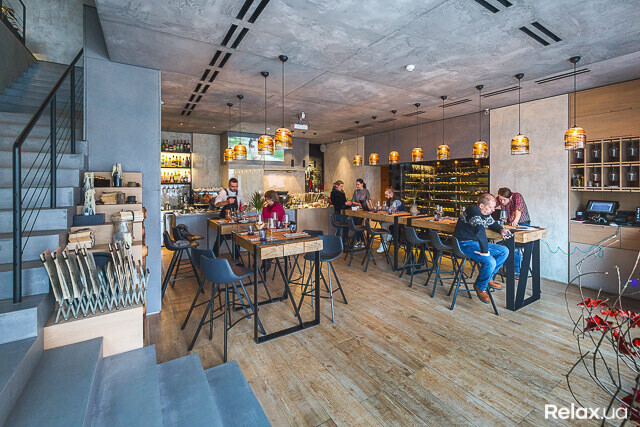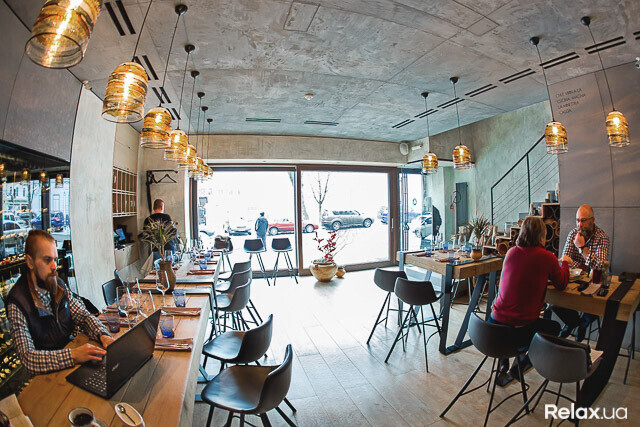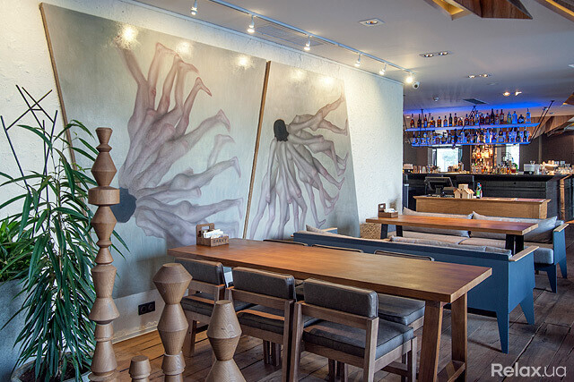 Переходя от культурного концепта к кулинарному, стоит отметить, что все продукты, что здесь используются, — украинского производства. Даже моллюски местные, выловленные под Херсоном и помещенные в аквариум с водой из Черного моря. Попробовать рекомендуют, например, салат с листьями одуванчика, клюквой и вурды, отварного сыра из овечьего молока (около 5 BYN), телячьи мозги с соусом из конопли (около 6 BYN), бычьи яйца с обжаренным маслом и клюквой по такой же цене, бигос с жареными грибами, который подается в сдобной булке (около 6,5 BYN), вареники с халвой (около 5 BYN).