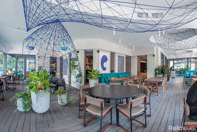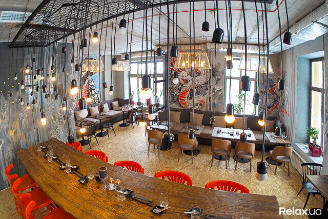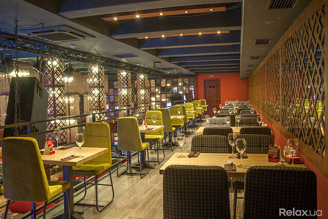 Внутри заведения удивляет необычно большое пространство основного зала, с потолка которого спускаются диковинные люстры. При этом вся мебель полностью мобильна, благодаря чему в ресторане можно проводить мероприятия любого формата. По четвергам, пятницам и субботам со сцены здесь играет легкий джаз-лаунж.