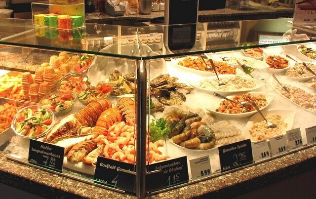 Свежая рыба тут стоит $3-8,5, а полноценная кухня предлагает еще закуски ($1,5-4), салаты ($2-6), горячие блюда ($3-8; например, спагетти с креветками обойдутся в $6 за 300 граммов) и десерты ($1,5).