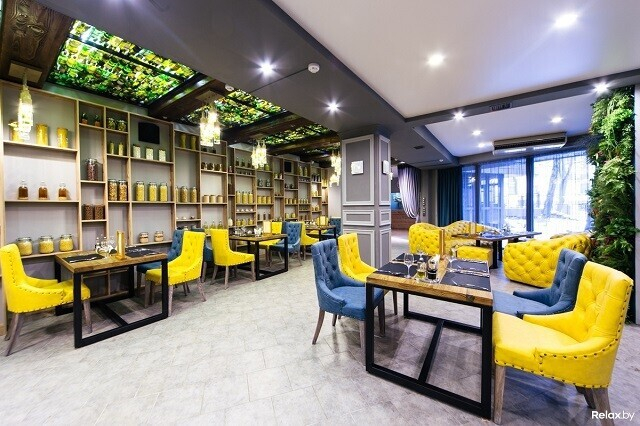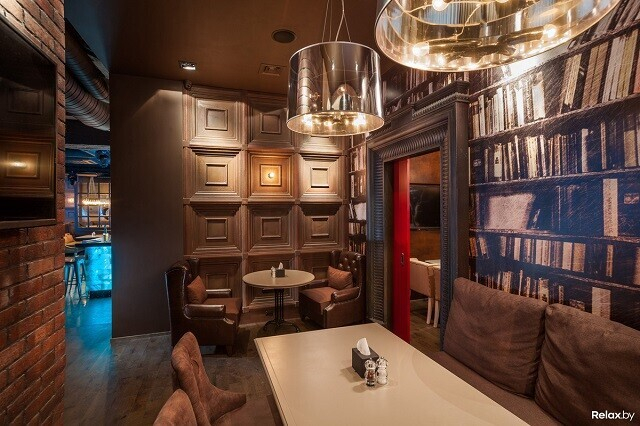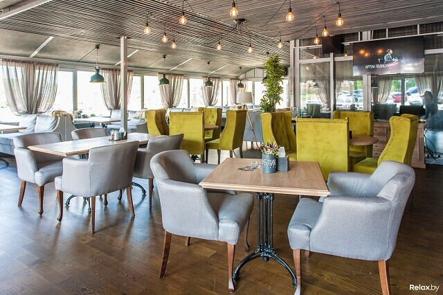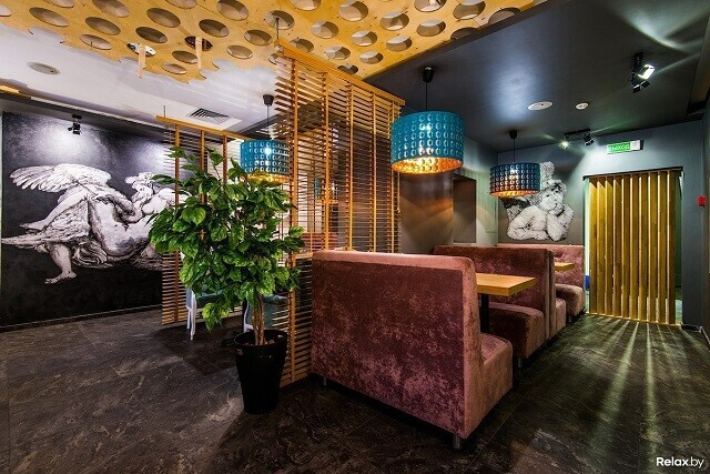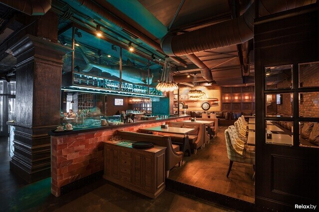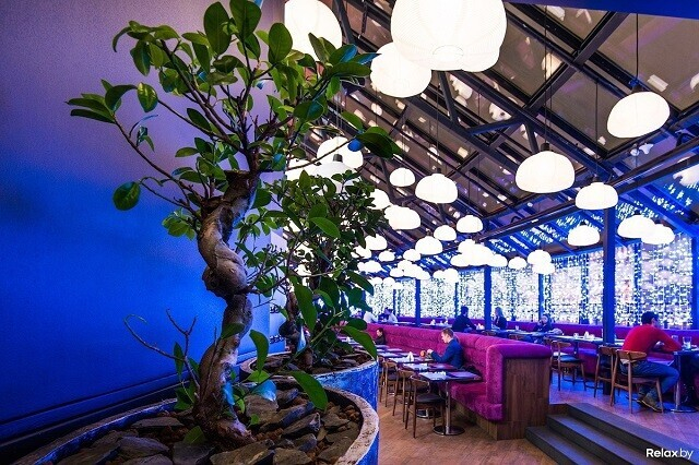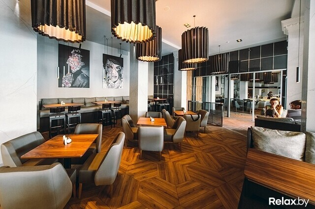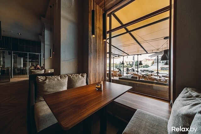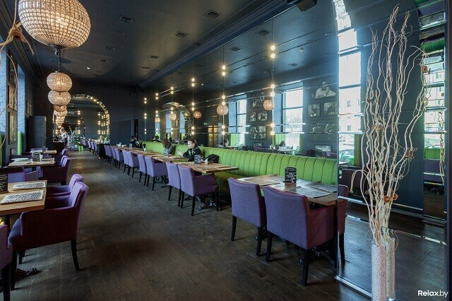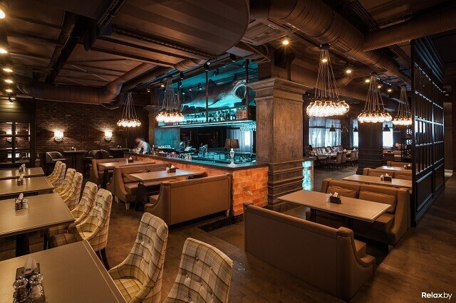 Лофтовый интерьер может похвастаться дизайнерскими решениями известных художников и архитекторов. Два значимых акцента здесь — 4-метровая тигровая акула под потолком и притягивающая взгляд картина во всю стену. Особенно романтично в ресторане по четвергам, когда комнаты заполнены звуками живого джаза. По пятницам и субботам веселее: играют топовые минские кавер-бэнды. Внутри свет приглушенный, однако, если хочется посидеть в компании зимнего, но согревающего душу солнца, можно разместиться на террасе.