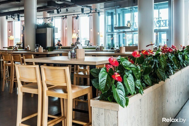 Помещение, отвечая названию, стилизовано под веранду: в интерьере много дерева, живых растений и природных тонов в отделке. Пространство воистину огромное, а еще больше оно кажется благодаря «незашитому» потолку и витринным окнам. Здесь есть зона с высокой мебелью, мягкая зона с большими диванами, зона пиццы и барная зона.
