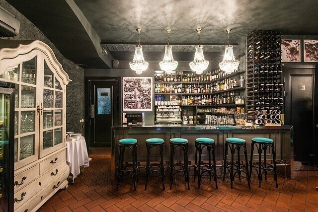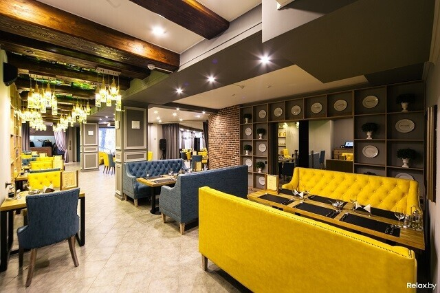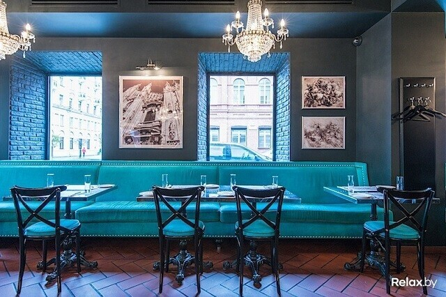 Интерьер — своего рода компромисс: современный дизайн, фактурная мебель, харизматичный декор и соседствующие с ними знакомая планировка и колонны с лепниной. Атмосферу в лаунж-зоне пятничными и субботними вечерами поддерживает живой джаз и блюз. В винном баре и на террасе можно послушать DJ-сеты. Кстати, с террасы открывается отличный вид на проспект и площадь Победы — тут очень атмосферно, когда зажигаются огни.