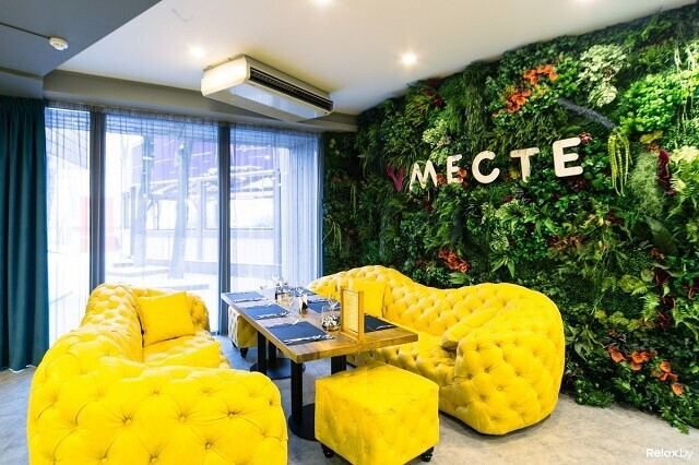 Гастрономический бар Vместе тяготеет к стилю лофт: в оформлении использовали кирпич, дерево, стекло и металл, но его разбавили яркой желтой и синей мебелью, обилием живой зелени (все здесь обязательно фотографируются на фоне увитой растениями стены) и крутыми декорациями, тарелками на стенах, стеллажами с любопытным содержимым полок. Другого такого же веселого заведения в Минске не сыскать. Каждую пятницу и субботу играет живая музыка.