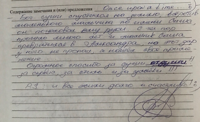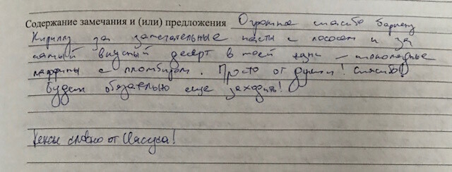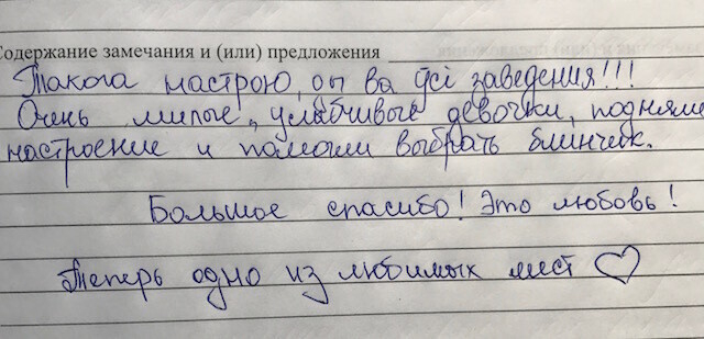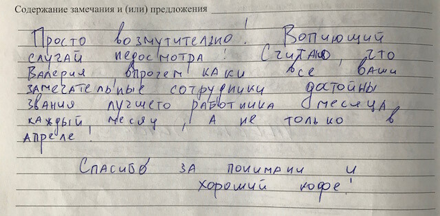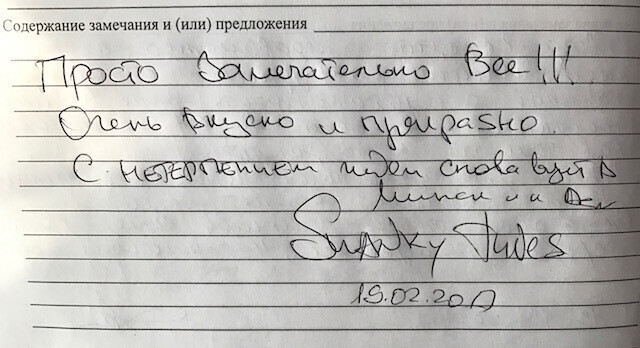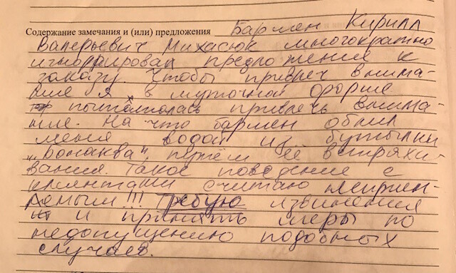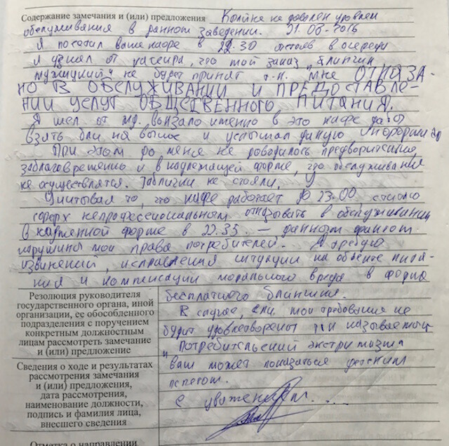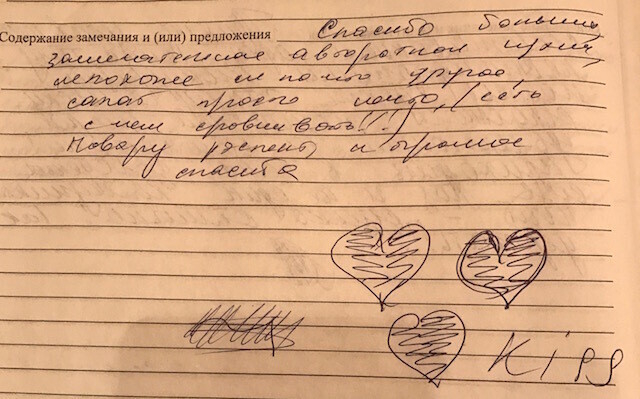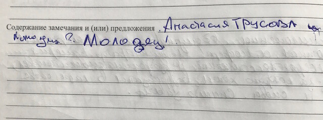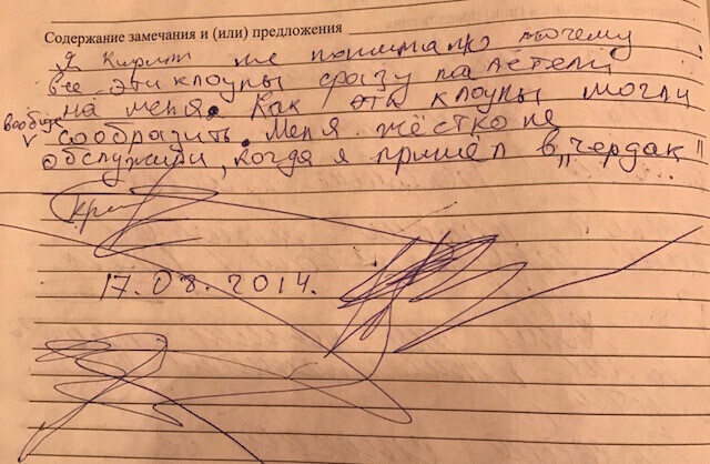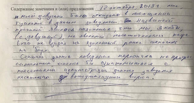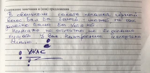 Надо сказать, что чаще всего просьбу подать книгу замечаний работники встречают с недоверием. В нескольких заведениях уточнили, что не принести не имеют права, но фотографировать странички запретили. Далее орфография и пунктуация записей сохранена.