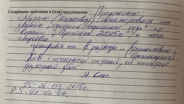 В самой книге замечаний и предложений обнаружилось больше похвалы, чем недовольства. Например, Иван настолько проникся к официантке Марии, что предложил номинировать ее на звание «Лучший официант года». Свое мнение молодой человек подкрепил цитатой из Коласа: «Жывi i шчырасцi шукай, аб шчырасцi духоунай дбай».