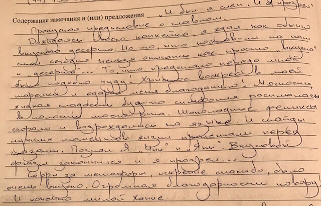 Тем не менее хвалебных записей в книге предостаточно. С Артемием и вовсе произошел гастрономический экстаз: «И был я слеп. И я прозрел […] То, что предстало передо мной было подобно чуду! Христос воскрес в моей тарелки и одарил меня благодатью. Мягкость, жидкая сладость будто симфонией расплылась в полости моего рта. Шоколадные фениксы сгорали и возрождались на языке […]». Речь о капкейке.