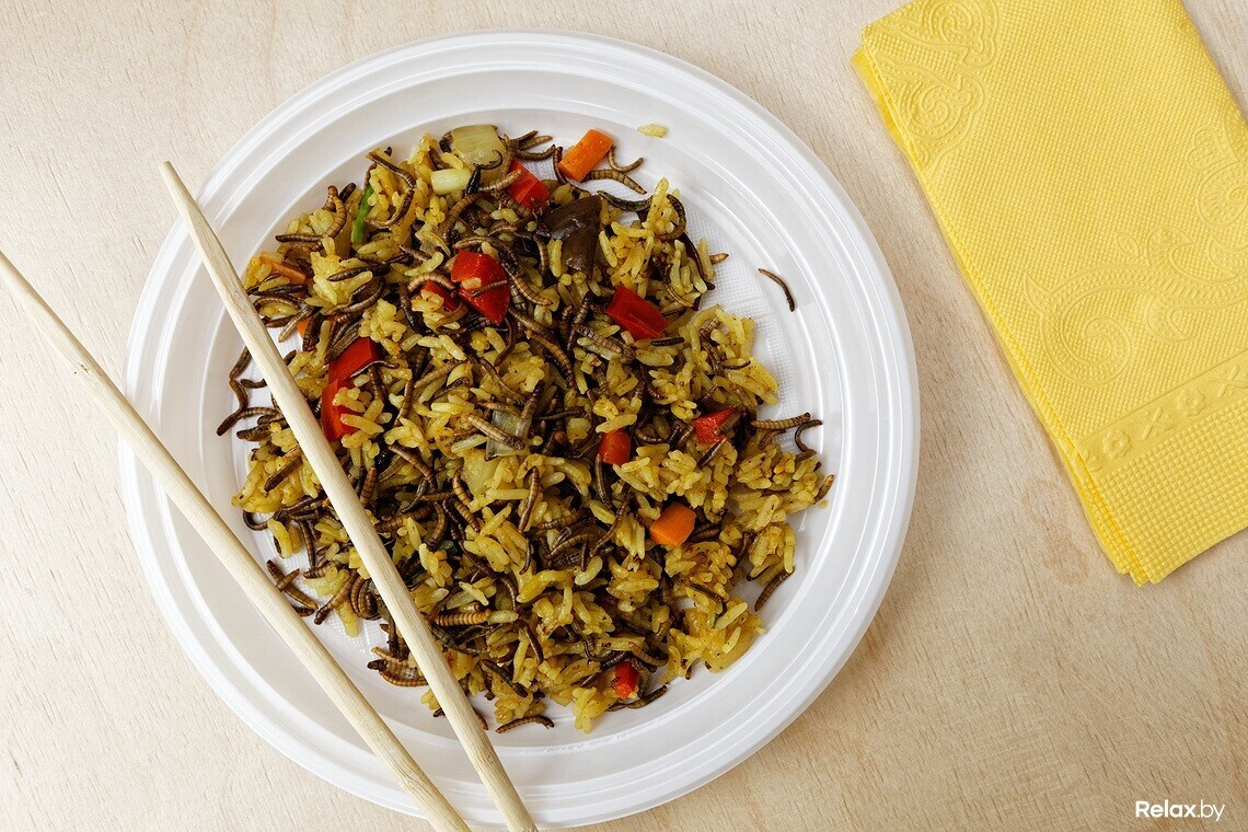 А теперь гвоздь программы — мучные черви с рисом. Наши дегустаторы под неизгладимым впечатлением от внешнего вида предложенного блюда.